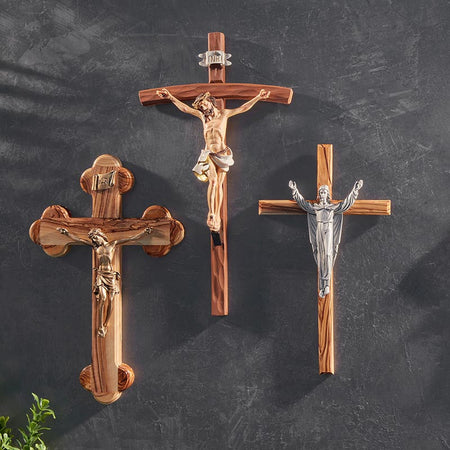 This Budded Crucifix features an antique gold plated Corpus and classic INRI banner on beautiful Olive Wood from Jerusalem. The Olive Tree symbolizes God's unity and covenant with His people.