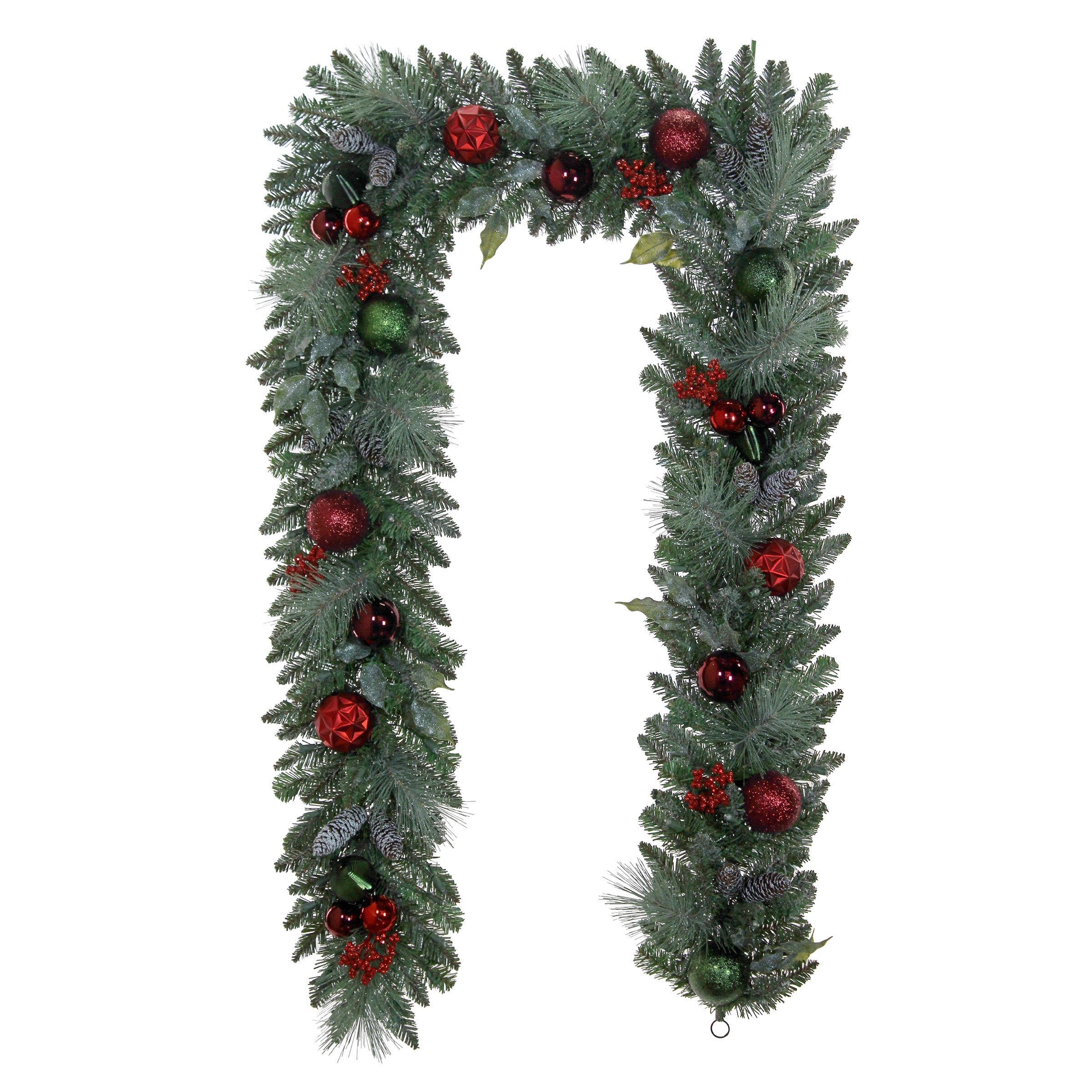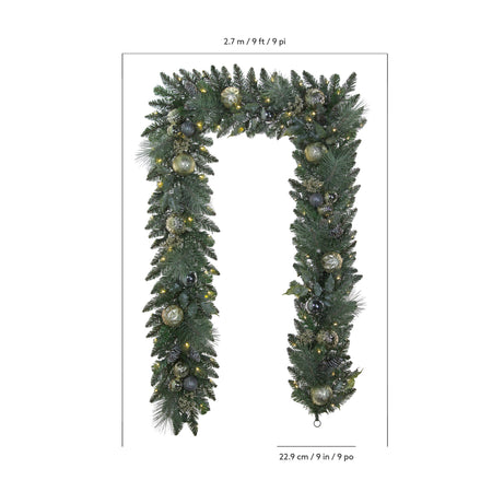 This 9-foot artificial Christmas garland comes pre-decorated and pre-lit with micro LED lights, creating a festive display without the hassle of stringing lights. The garland features artificial greenery with decorative elements and integrated LED lighting for a warm, welcoming glow.