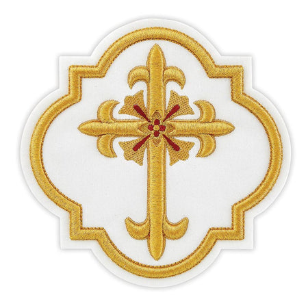 This appliqué is dura fabric bonding with gold metallic embroidered accent and are perfect for creating an elegant vestment and banner.