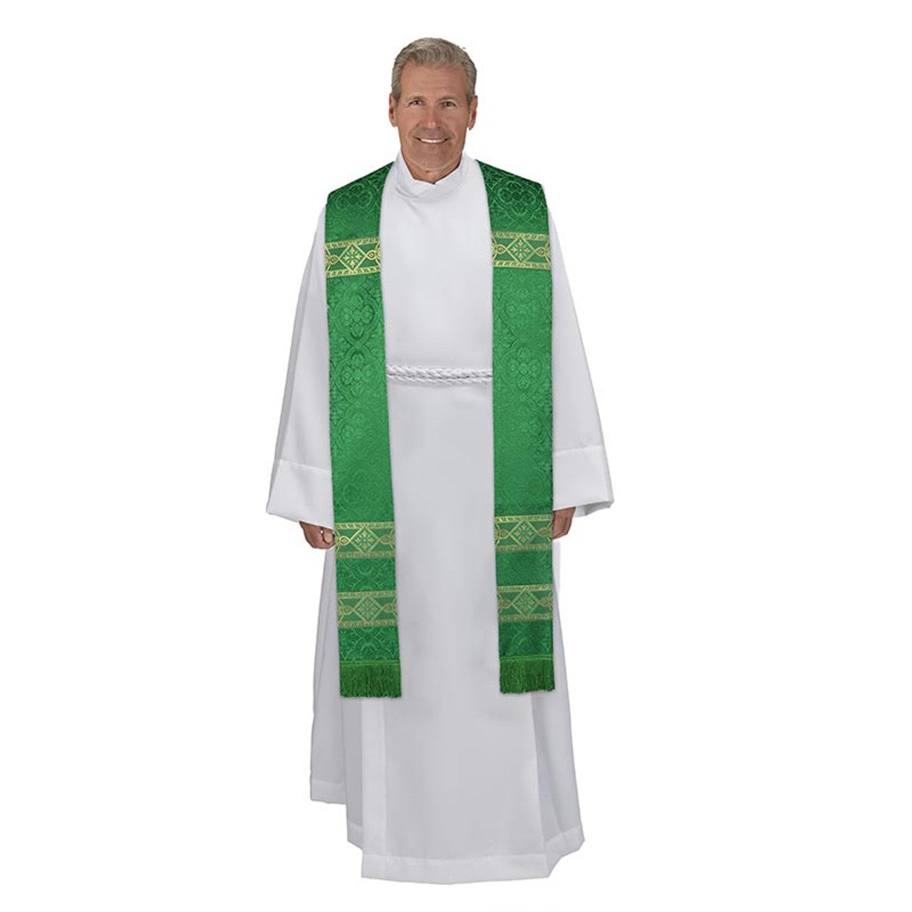 Each stole features a floral damask base fabric with gold metallic jacquard banding, custom dyed fringe and matching satin backing.