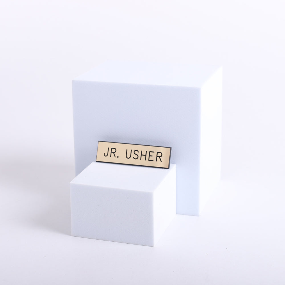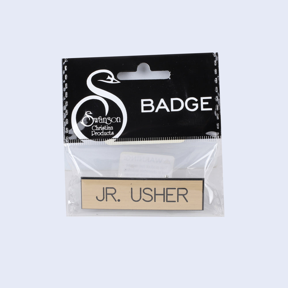 his gold and black “Jr. Usher” badge is designed with both style and practicality in mind, making it an ideal choice for young volunteers or team members. The badge features the words “Jr. Usher” engraved in bold, all-caps lettering, ensuring clarity and easy visibility. With its clean lines, smooth edges, and shiny gold finish, it exudes a classic and polished appearance that complements any attire.