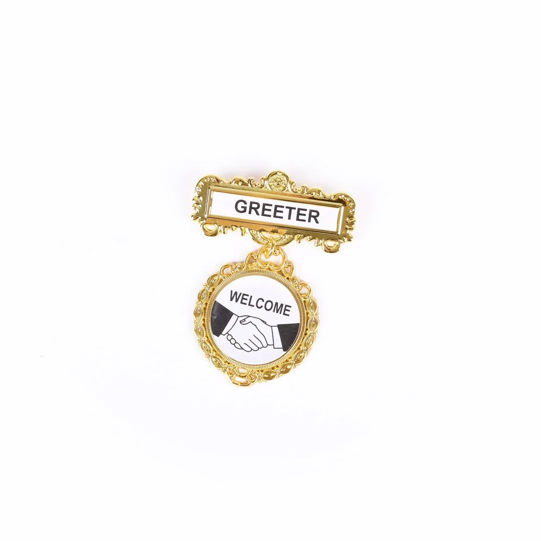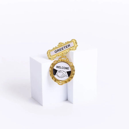 This beautifully designed, golden “Greeter” Badge is the ideal accessory for Church services and events where clear identification is crucial. Featuring a top bar with elegant scrollwork edges, it adds a touch of sophistication to any attire. The badge itself is a fancy round design, delicately engraved to ensure a refined and professional appearance that complements any outfit.