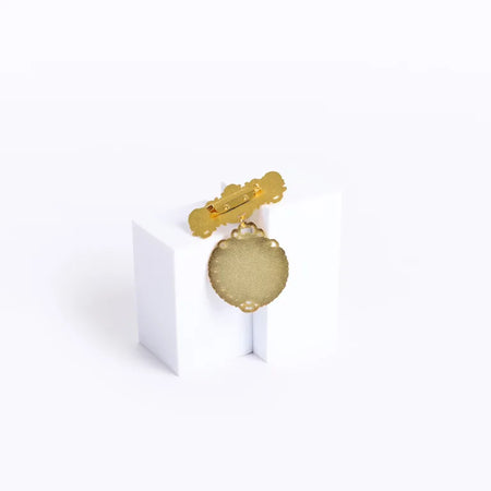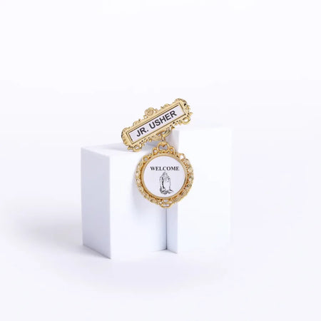 This beautifully designed golden badge is perfect for church services and events where clear identification is necessary. Featuring a top bar with beautiful scrollwork edges and a fancy round badge with delicate engraving.