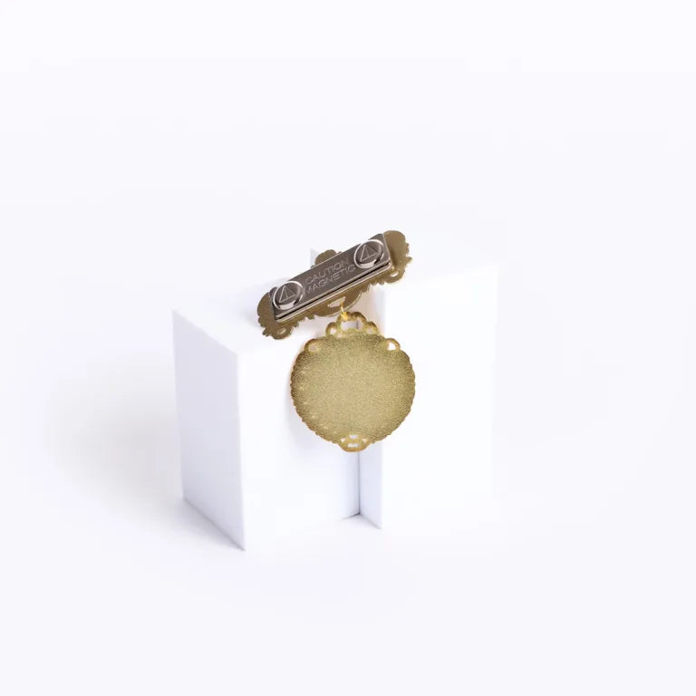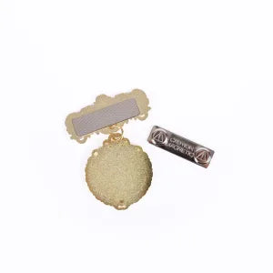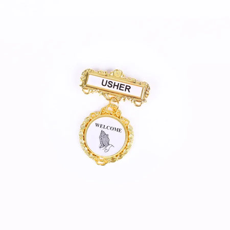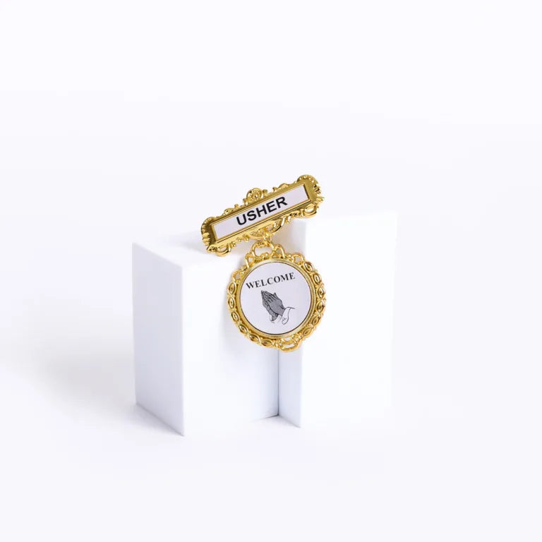 This beautifully designed, golden badge is the ideal choice for church services and events where clear identification is essential. Featuring a top bar with exquisite scrollwork edges and a fancy round badge with delicate engraving, this badge combines elegance with purpose.