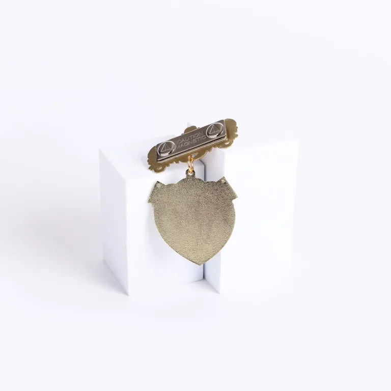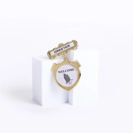 This beautifully designed, golden badge is perfect for church services and events where clear identification is necessary. Featuring a top bar with delicate scrollwork engraving and a shield badge with simple, smooth edges, this badge combines elegance and functionality.