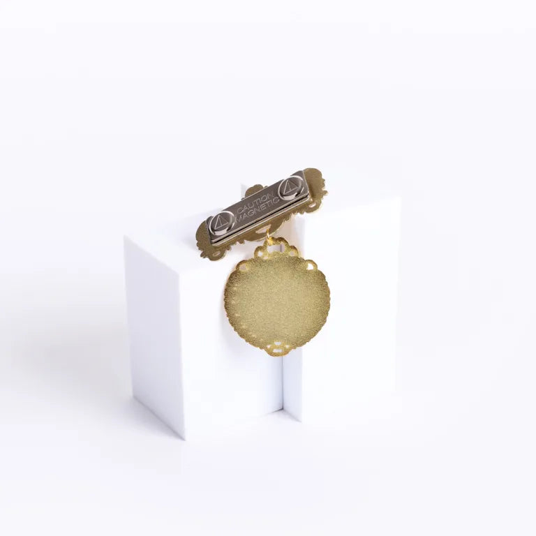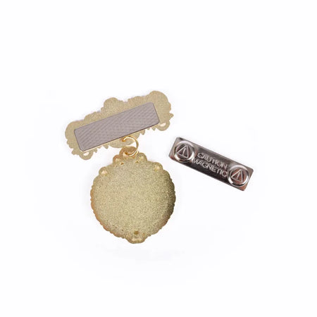 This beautifully designed golden badge is the perfect accessory for church services and events where clear identification is essential. Featuring a top bar with elegant scrollwork edges, and a fancy round badge with delicate engraving, this badge exudes a refined and polished look.