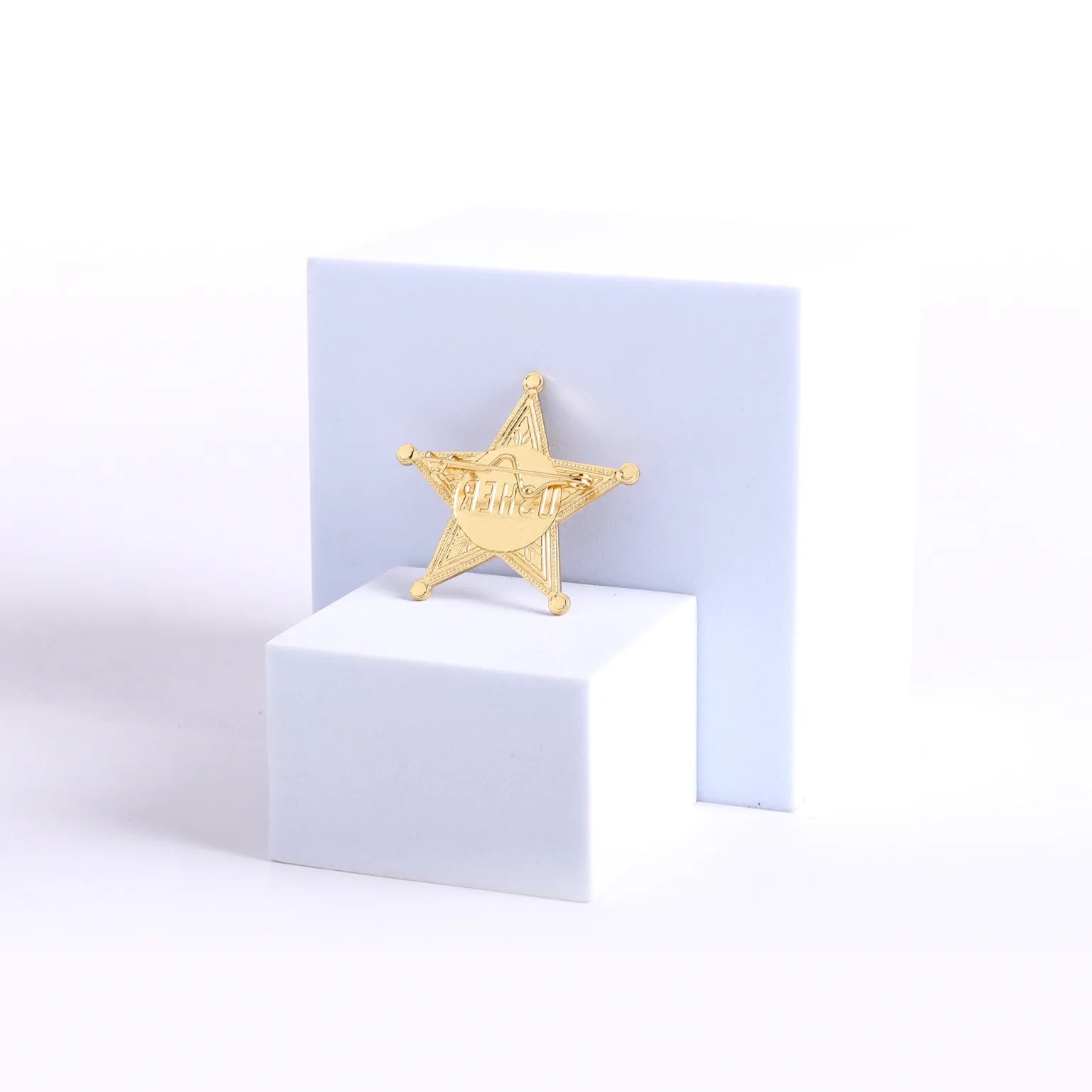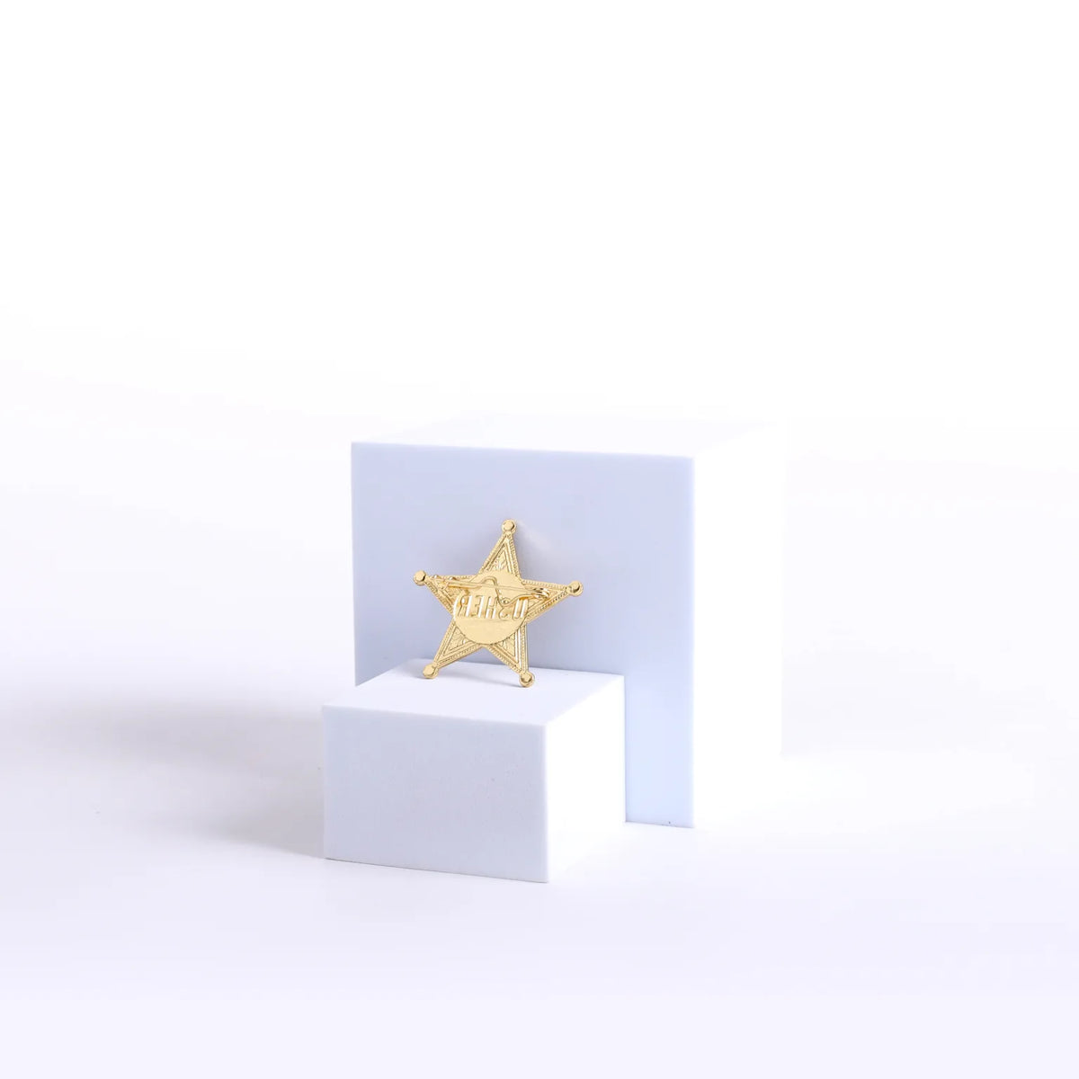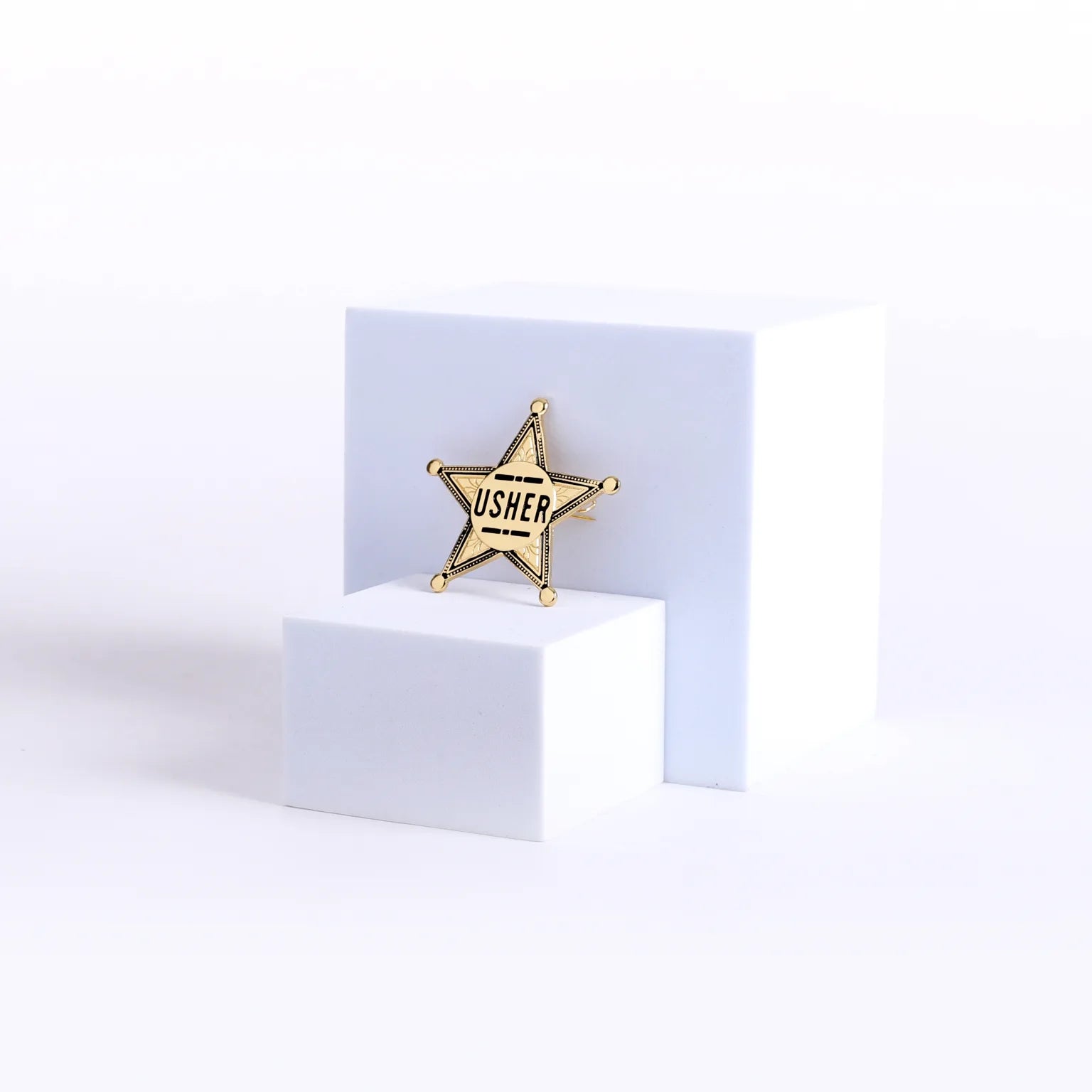 This gold star badge, featuring the word “Usher” carefully engraved, offers a distinguished and polished look. Measuring 2 inches in diameter, the badge is designed with a shiny gold finish that creates a refined, elegant appearance. The intricate engraving of “Usher” ensures the text is clear and durable, making it easily readable and professional.