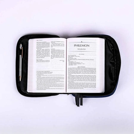 Made from high-quality, water-resistant canvas, this Bible cover is built to withstand outdoor elements, spills, and general wear and tear. The rugged yet lightweight material ensures durability without adding bulk, making it easy to carry wherever you go. The secure zipper closure keeps your Bible safely enclosed, preventing pages from bending or getting damaged.