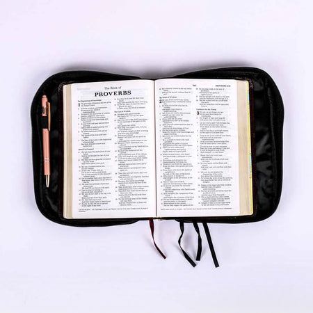The cover includes a convenient carry handle, making it easy to take your Bible with you wherever you need to go. It also features a pen loop inside, allowing you to keep a pen or pencil handy, ideal for taking notes or marking important passages while reading. With the ribbon bookmark, you can easily pick up right where you left off without having to flip through pages.