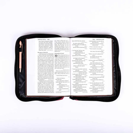 The cover features a convenient carry handle, allowing you to easily take your Bible wherever you go, ensuring that it remains within reach and safe from damage. Additionally, the inside of the cover includes a pen loop, allowing you to keep a pen or pencil close by for taking notes or marking important passages as you read. The thoughtful inclusion of a ribbon bookmark makes it easy to pick up where you left off in your Bible, without having to waste time searching for your last spot.