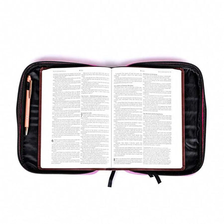 Includes a convenient carry handle, and a zippered pocket on the front that makes it easy to carry your Bible, notes, study tools and more, anywhere you go. The pen loop on the inside allows you to keep a pen or pencil close at hand, so you can take notes or mark passages as you read. The ribbon bookmark ensures that you can easily pick up where you left off, and the sturdy zipper with engraved pull tab keeps the cover securely closed when not in use. Whether you’re heading to church, a Bible study group, or on a trip, this cover will keep your bible protected and easily accessible.