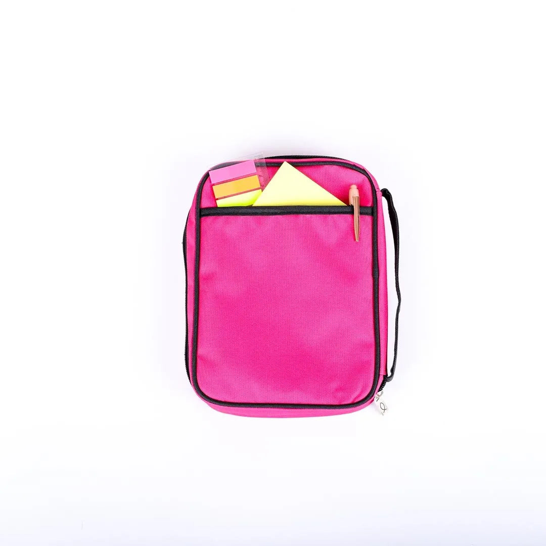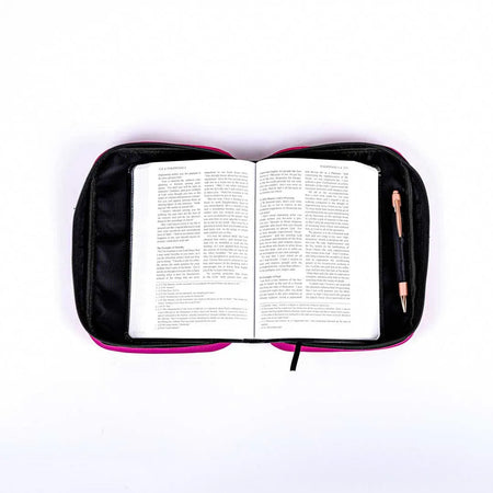 This bible cover is the perfect way to protect your bible while on the go. The durable canvas material will keep your Bible safe from scratches, spills, and drops. Features a convenient carry handle, making it easy to take with you wherever you go. The pen loop on the inside allows you to keep a pen or pencil close at hand, so you can take notes or mark passages as you read. The ribbon bookmark ensures that you can easily pick up where you left off, and the sturdy zipper keeps the cover securely closed when not in use. Whether you’re heading to church, a Bible study group, or on a trip, this cover will keep your bible protected and easily accessible.