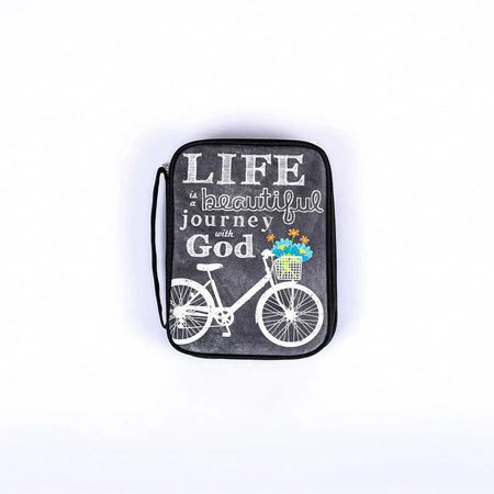 The cover is grey and black, and features a screened-imprint design of “Life is a Beautiful Journey” in white. The design is bold and inspiring, and will be a constant reminder of your faith and inspiration.
