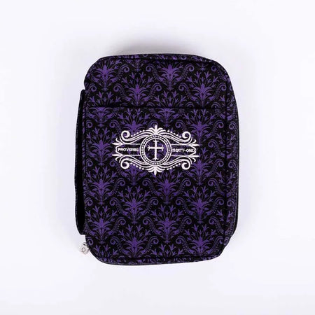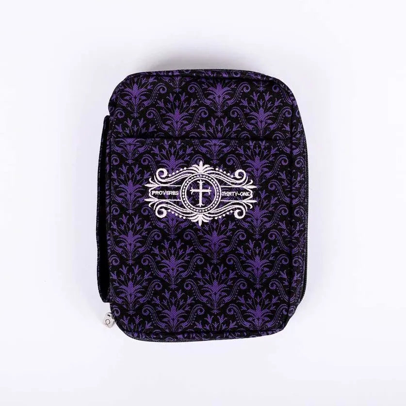 This stylish, functional, and durable Bible cover is thoughtfully designed to inspire and empower women. Featuring Proverbs 31, the cover is made from purple canvas with elegant black designs and delicate pink embroidery, making it a perfect accessory for those who wish to carry their Bible in both style and faith.
