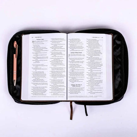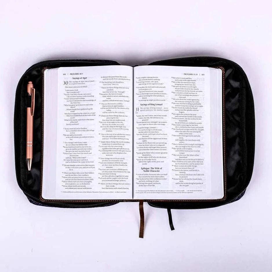 The cover is equipped with an outer pocket on the back, offering convenient storage for small essentials such as notepads, cards, or other personal items. Its sturdy carry handle makes it easy to take your Bible wherever you go—whether it’s to church, Bible study, or on your travels. The pen loop inside ensures that you always have a pen or pencil on hand for note-taking or marking important passages.
