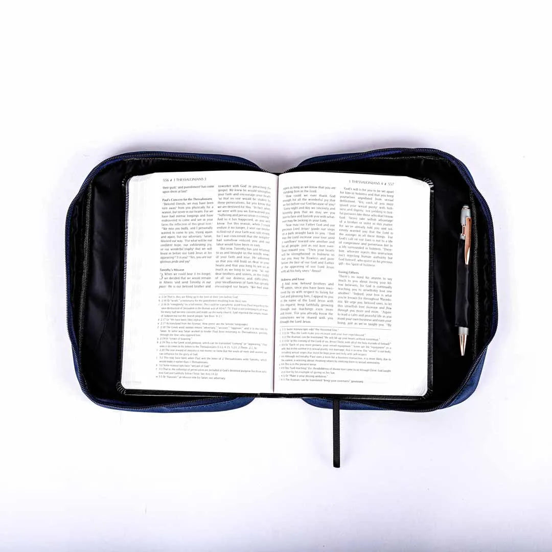 This bible cover is the perfect way to protect your bible while on the go. The durable canvas material will keep your Bible safe from scratches, spills, and drops. Features a convenient carry handle, making it easy to take with you wherever you go. The pen loop on the inside allows you to keep a pen or pencil close at hand, so you can take notes or mark passages as you read. The ribbon bookmark ensures that you can easily pick up where you left off, and the sturdy zipper keeps the cover securely closed when not in use. Whether you’re heading to church, a Bible study group, or on a trip, this cover will keep your bible protected and easily accessible.