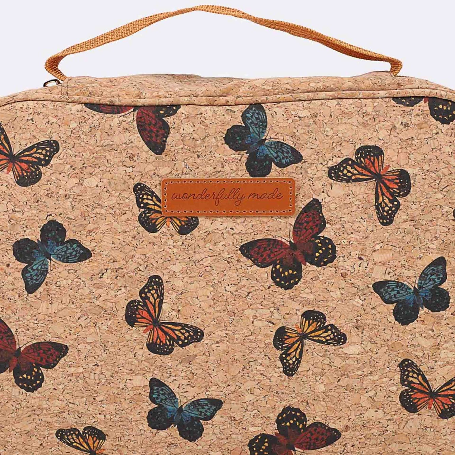 The exterior is adorned with a butterfly pattern in shades of red, orange, blue, and yellow against the natural light brown base, bringing a touch of inspiration and beauty to your times of bible study and travel. A sewn-on patch debossed with the message “Wonderfully Made” serves as a gentle reminder that God has always had a plan and design for you. This cover fits Bibles up to 8″ x 10.75″ x 2.5″, ensuring a versatile yet protective fit. A durable polyester-cotton handle offers easy carrying, and the golden zipper with a cross-engraved pull tab adds a final elegant touch.