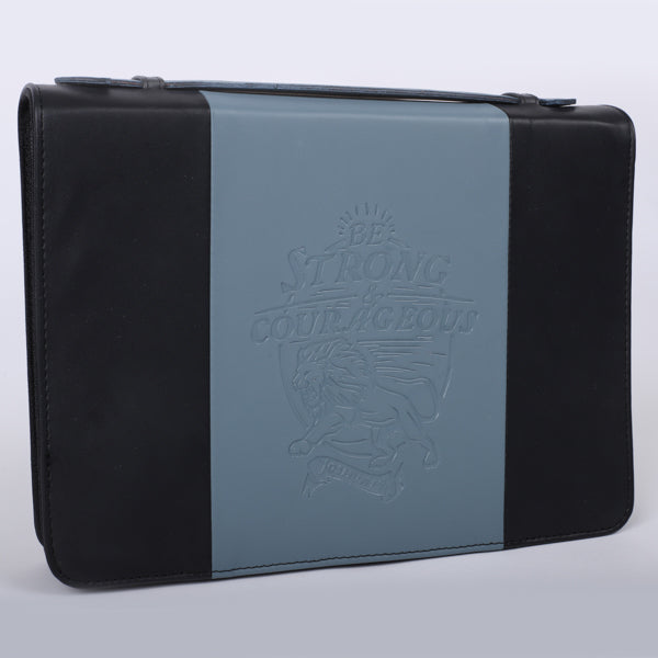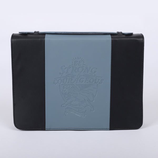 Safeguard your Bible with our Be Strong and Courageous Extra-Large Bible Cover, crafted from premium imitation leather. This striking cover features a sophisticated two-toned design in black and steel grey. The front is adorned with the empowering verse from Joshua 1:9—”Be strong and courageous”—paired with a dynamic image of a roaring lion, symbolizing faith, strength, and resilience.