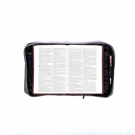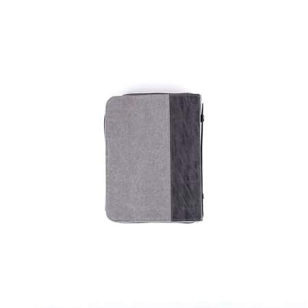 Support and protect your bible in a stylish way with this Imitation leather and canvas bible cover. designed with hardcover front and back panels and a PVC Patch design of “Strong & Courageous” in the colors black and grey. Includes a carry handle, pen loop, ribbon bookmark, and a zipper pull engraved with a fish.