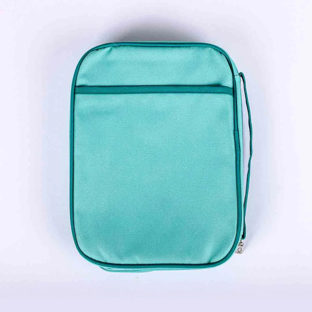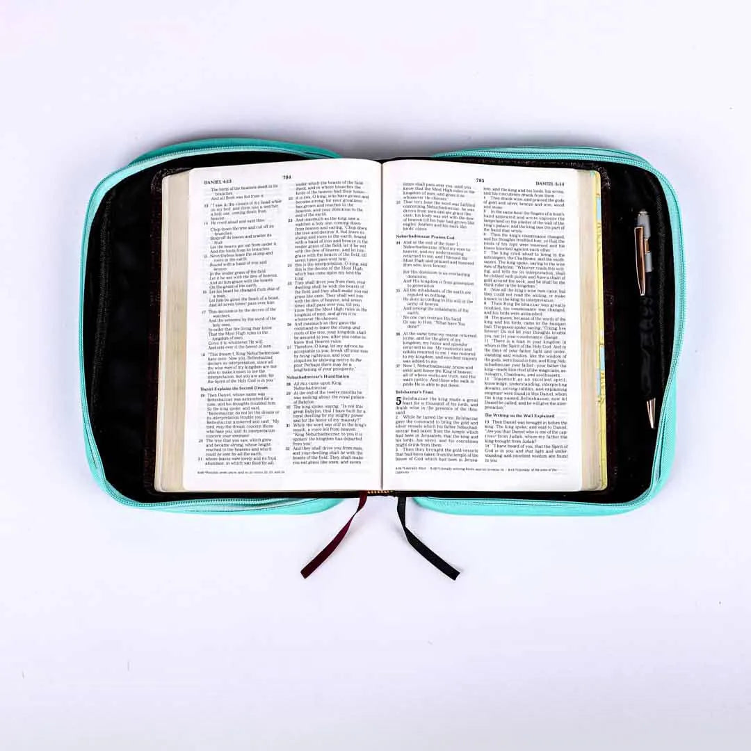 This bible cover is the perfect way to protect your bible while on the go. The durable canvas material will keep your bible safe from scratches, spills, and wear and tear. Features a convenient carry handle, making it easy to take with you wherever you go. The pen loop on the inside allows you to keep a pen or pencil close at hand, so you can take notes or mark passages as you read. The ribbon bookmark ensures that you can easily pick up where you left off, and the sturdy zipper keeps the cover securely closed when not in use.