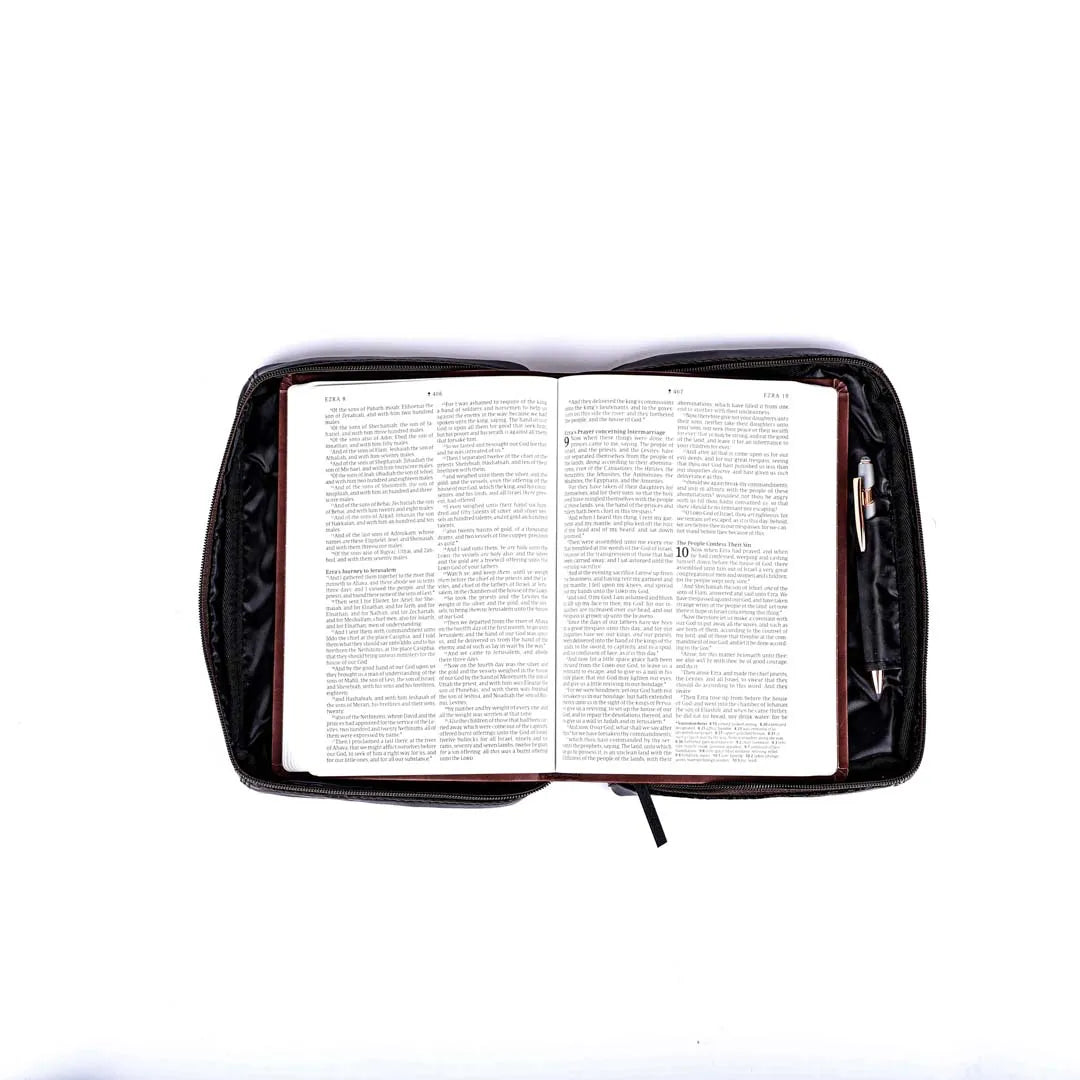 Designed with convenience in mind, this Bible cover features a sturdy carry handle, allowing you to take your Bible with you wherever you go. It also has a pen loop on the inside, making it easy to keep a pen or pencil handy for note-taking, marking important passages, or journaling. The ribbon bookmark makes it easy to pick up where you left off, providing quick access to your favorite verses and passages.