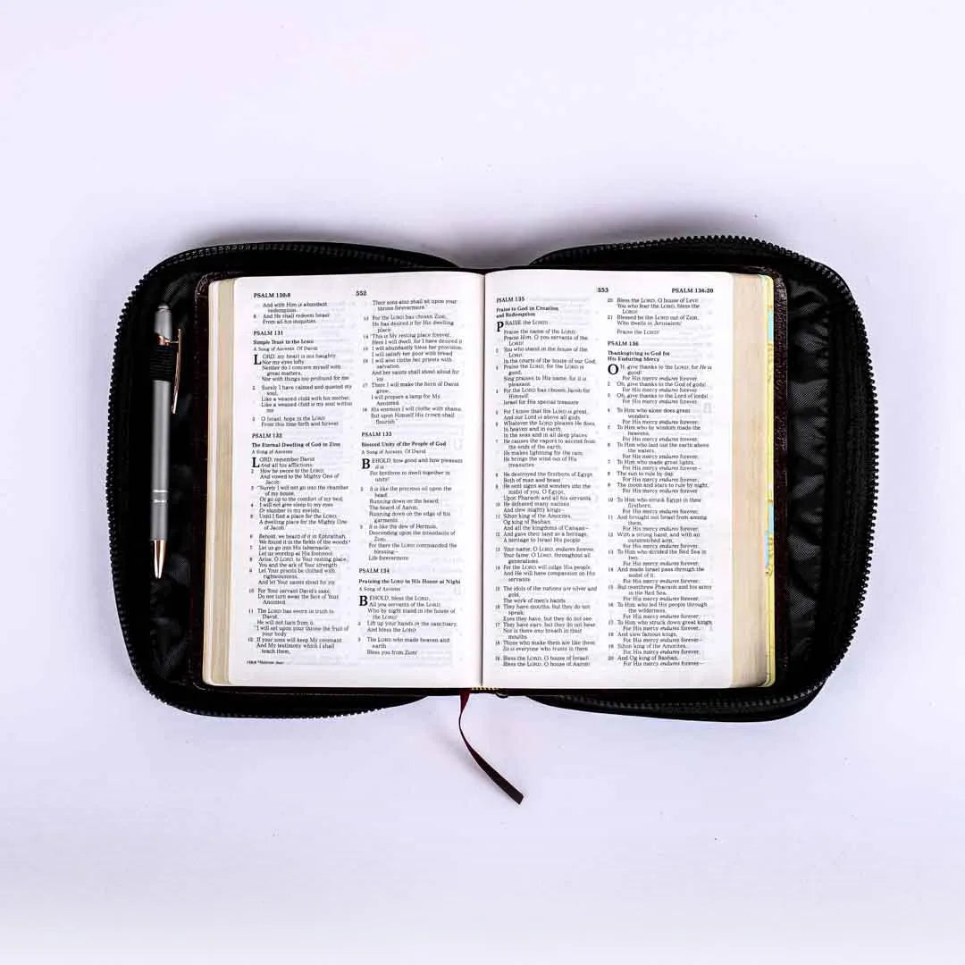The cover also features a convenient carry handle, making it easy to transport your Bible wherever you go. On the inside, you’ll find a pen loop that helps you keep a pen or pencil close at hand, perfect for jotting down notes or marking important passages. A ribbon bookmark makes it easy to pick up where you left off, so you don’t have to search for your spot in the Bible. The sturdy zipper closure ensures your Bible stays secure, preventing it from opening or getting damaged when not in use.