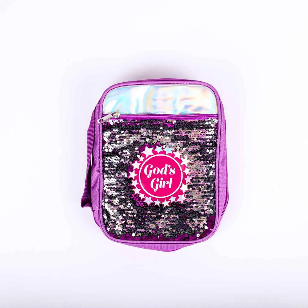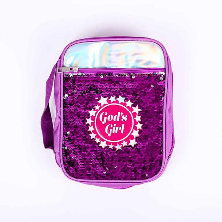 Designed with color-shifting, reversible sequins, this Bible cover offers a new and exciting way to inspire young girls. Featuring a rich purple base color and the message “God’s Girl,” the cover is adorned with shimmering purple and silver sequins, along with holographic and iridescent accents. The sequins shift with a swipe, offering a fun interactive feature.