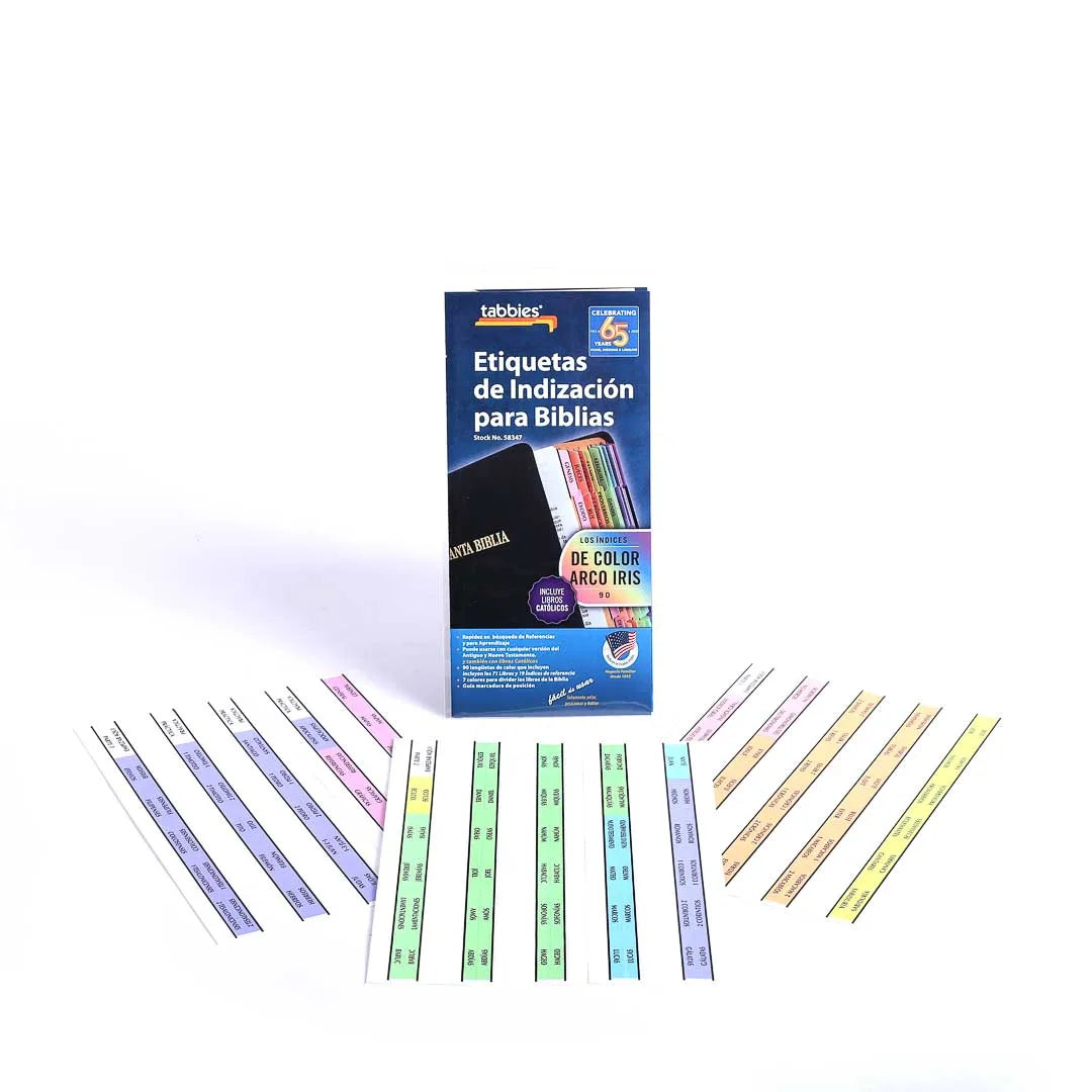 This set includes 64 assorted rainbow-colored tabs and 16 reference tabs for the Old and New Testaments, all printed in Spanish. The double-sided tabs feature a glossy finish for added durability and clarity. The seven vibrant rainbow colors are designed to divide the major sections of the Bible, helping you quickly identify and access specific books.
