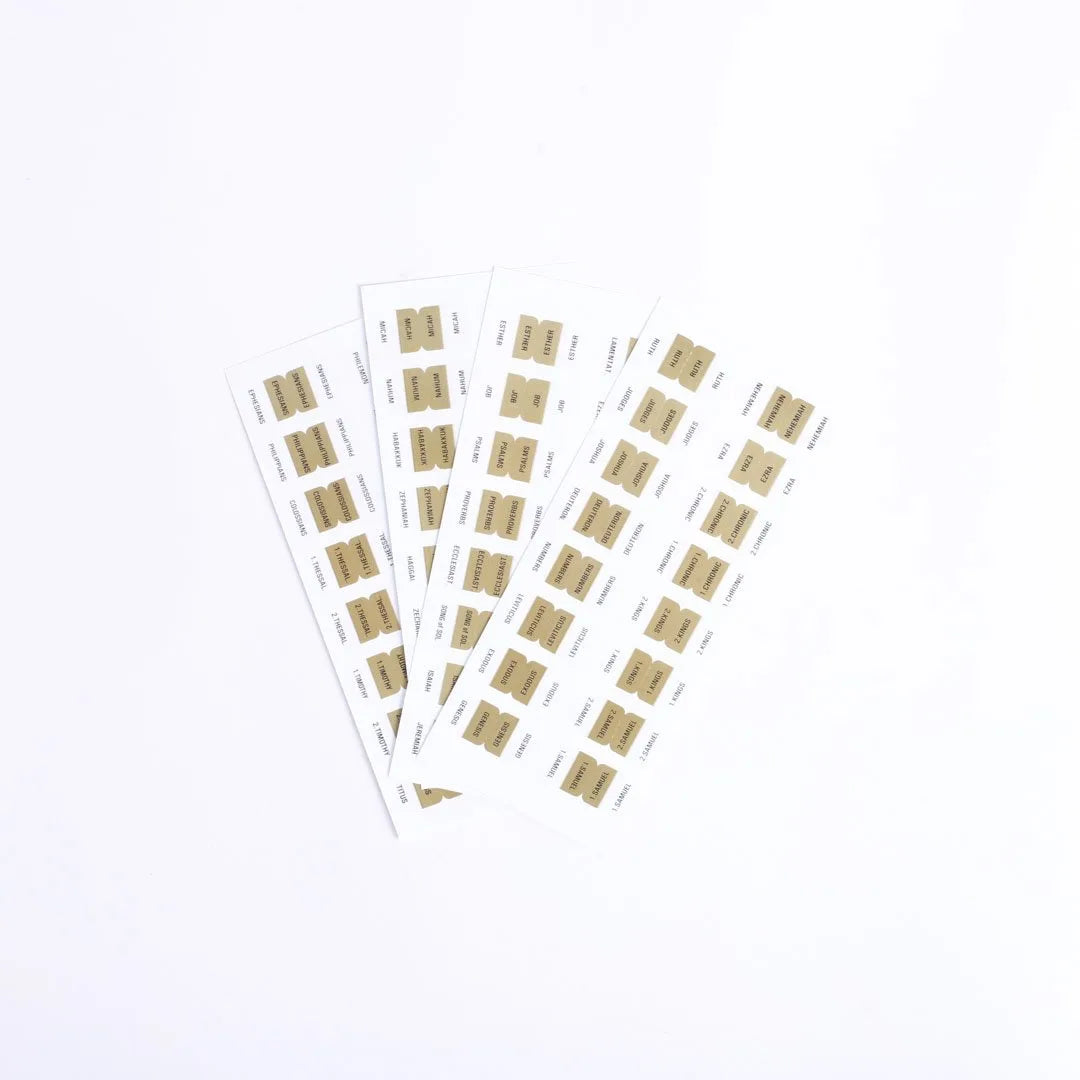 Each tab measures .5″ and is thoughtfully designed for ease of use. Pre-cut and self-adhesive, they’re simple to apply—just peel, position, fold, and stick! These durable tabs are perfect for all 66 books of the Old and New Testaments, helping you quickly locate chapters and verses with minimal effort. The glossy gold front and clear backing provide an elegant, timeless look, while the bold black lettering ensures clear readability on both sides.