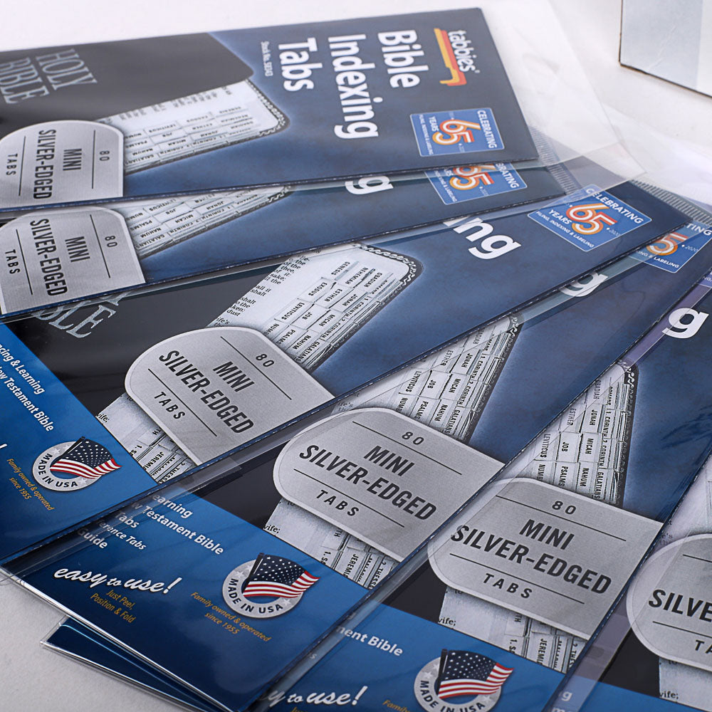 Enhance your Bible study experience with our Ten-Pack of Individually Packaged Mini Bible Indexing Tabs. Each individual pack contains 80 silver-edged tabs, thoughtfully designed to make navigating your Bible quicker and easier. These tabs are printed on both sides for effortless reading and are crafted to be durable, enduring regular use without wear and tear.