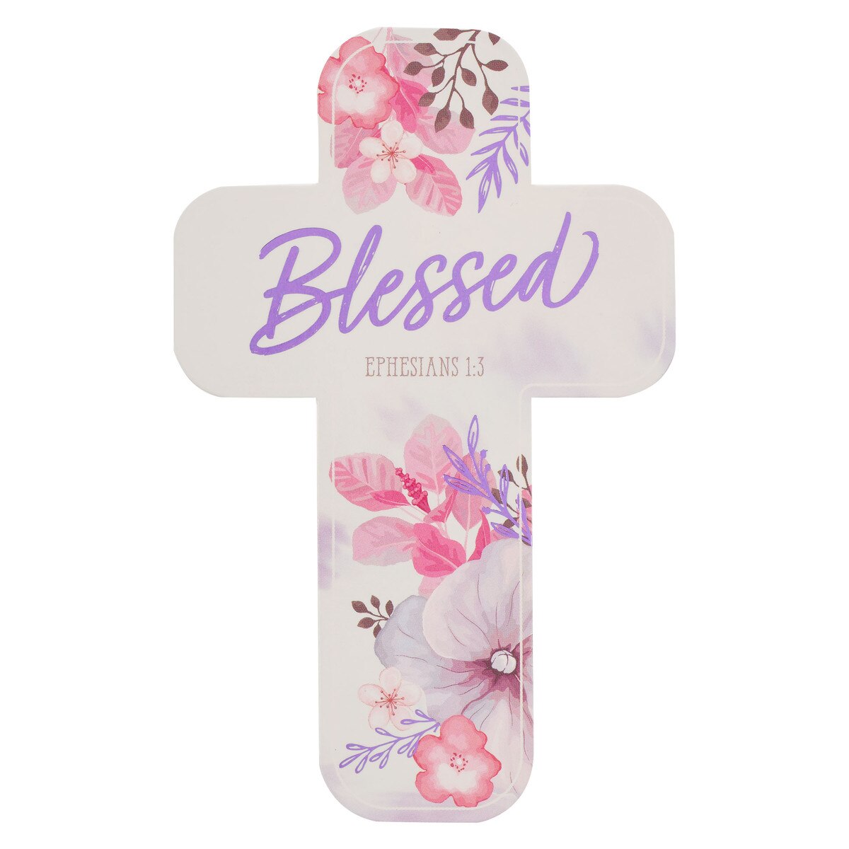 The soft white background of the cross-shaped bookmarks has a delicate white frame printed around its edge. Bright pink and purple flowers scattered with purple-foiled leaves surround the Scripture-based sentiment printed in scripted purple-foiled lettering to match.