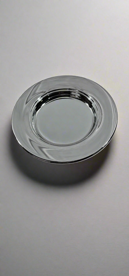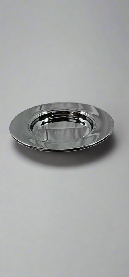 Each meticulously crafted piece of Artistic communion ware is designed to honor and glorify the solemn and sacred act of receiving holy communion. This solid chrome bread plate has a plated mirror like finish that may be wiped with a soft cloth or washed in lukewarm water.