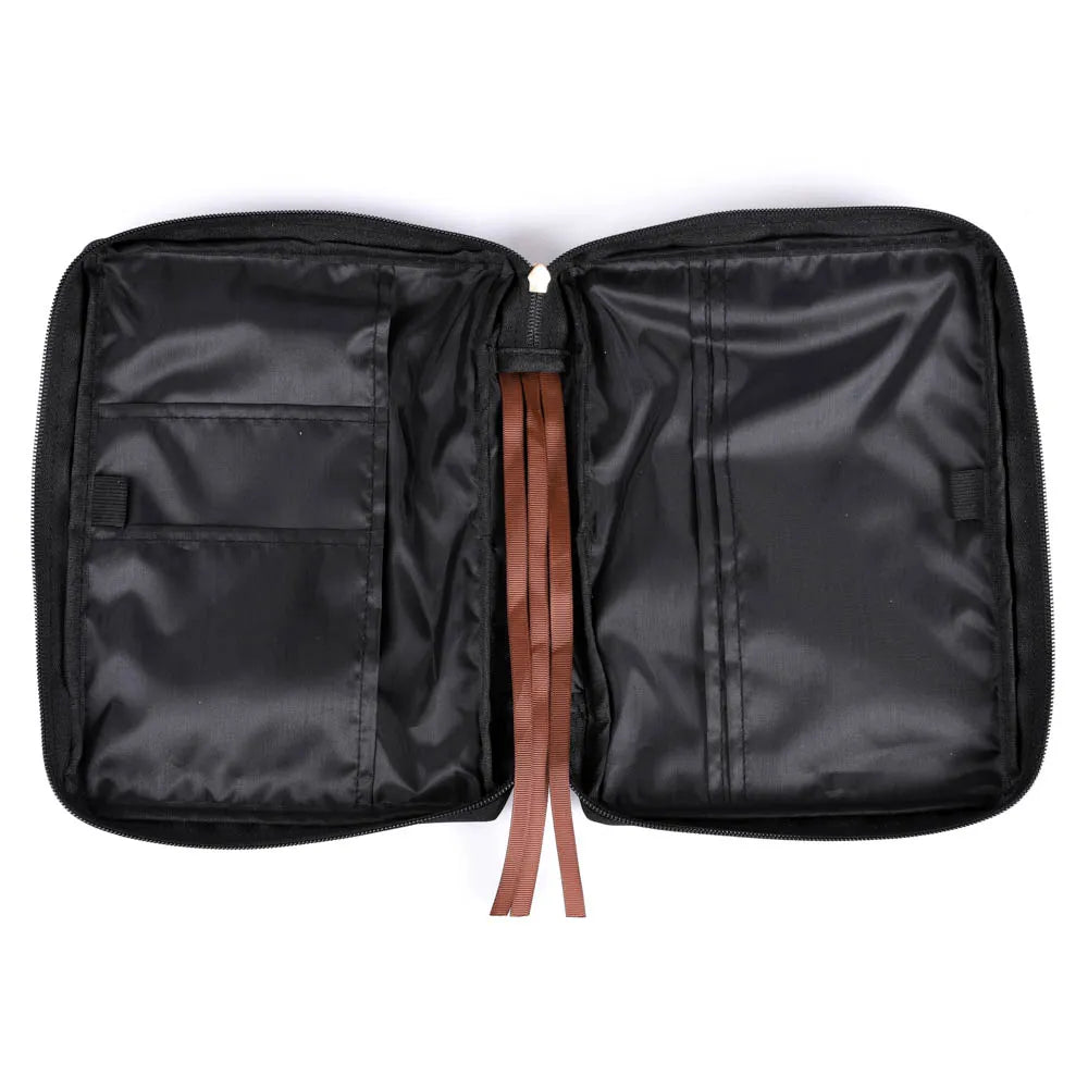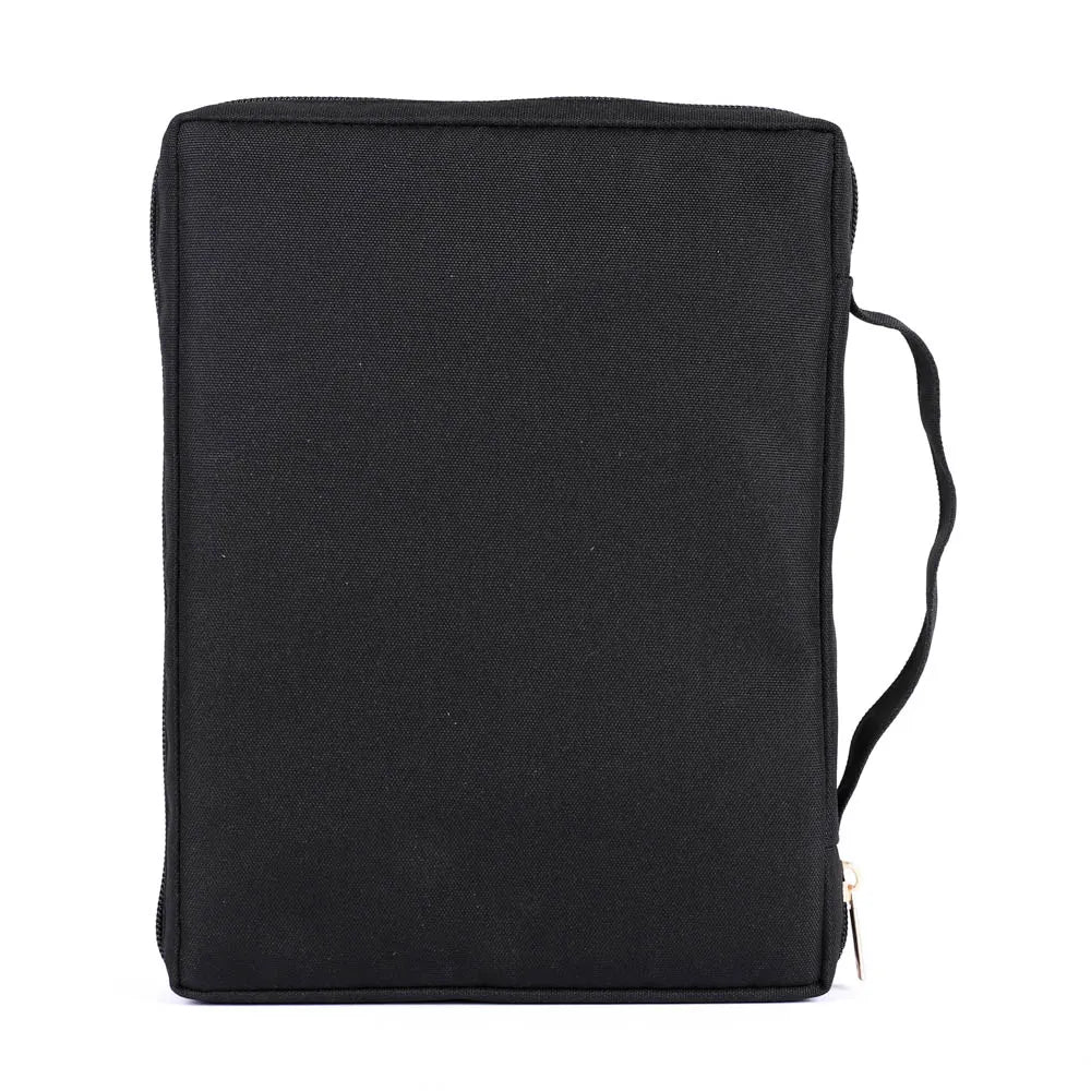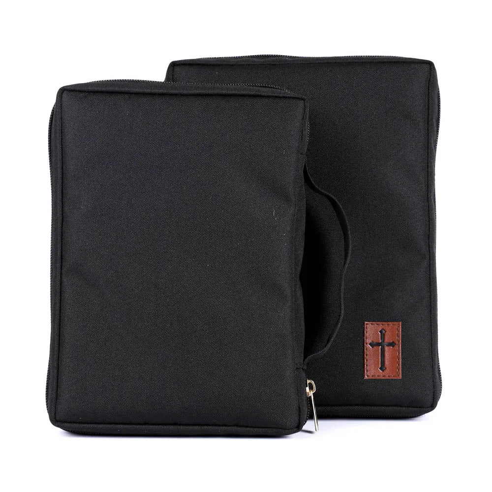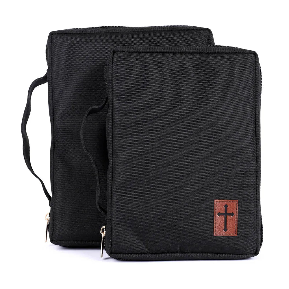 Embodying both style and functionality, the exterior is a solid and simple black, adorned with a simple design in the corner, featuring a debossed cross on a warm brown imitation leather patch. This bible cover becomes a practical and convenient choice with the addition of a sturdy canvas carry handle and a secure zipper closure, which will guarantee the safety of your Bible and accessories within.