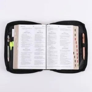 As an added bonus, the thoughtful design incorporates book flaps on either side, allowing the covers of your Bible to snugly tuck in for added security. Three ribbon bookmarks are fastened in the top of the spine, ensuring that you will never lose your place while reading and studying.
