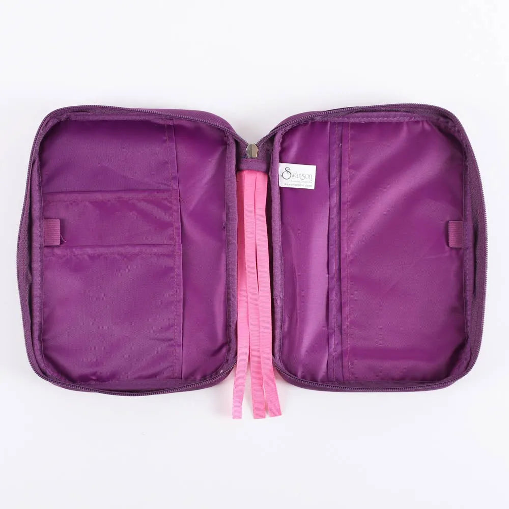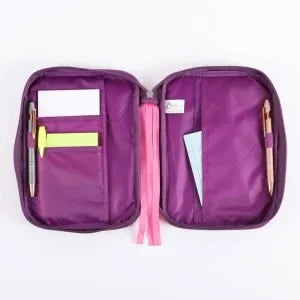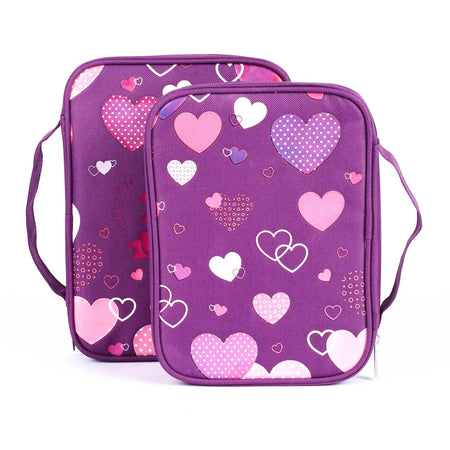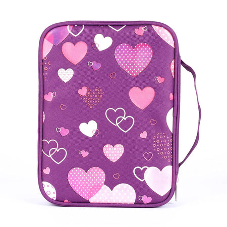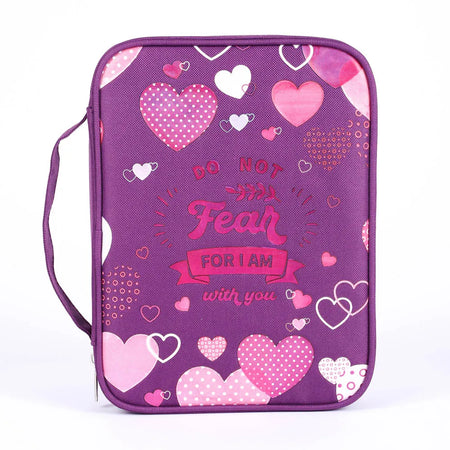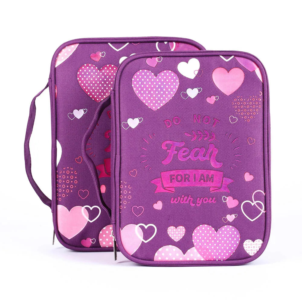 Embodying both style and functionality, the exterior features a bold purple hue, adorned with texturized hearts and a message of “Do Not Fear, For I Am With You” on the front, with the heart pattern repeated around the back. It becomes a practical and convenient choice with the addition of a sturdy canvas carry handle and a secure zipper closure, which will guarantee the safety of your Bible and accessories within.