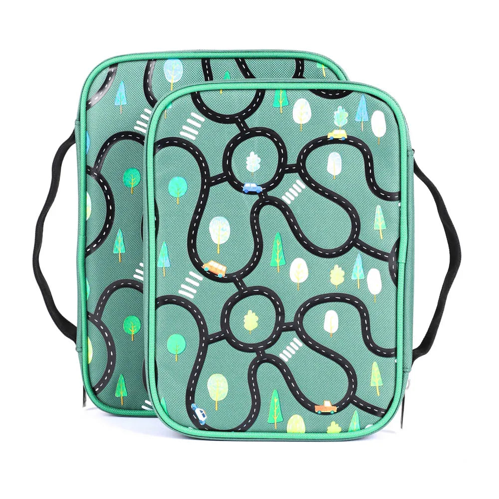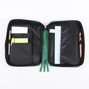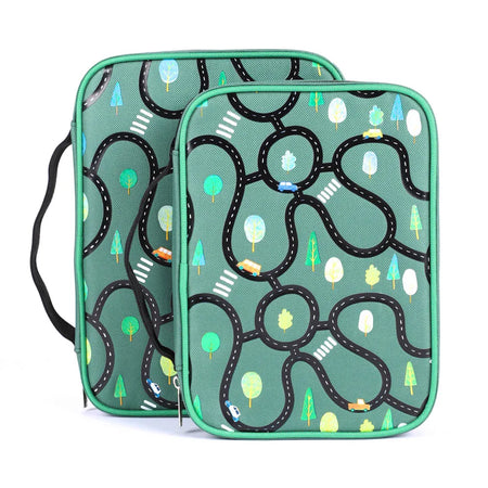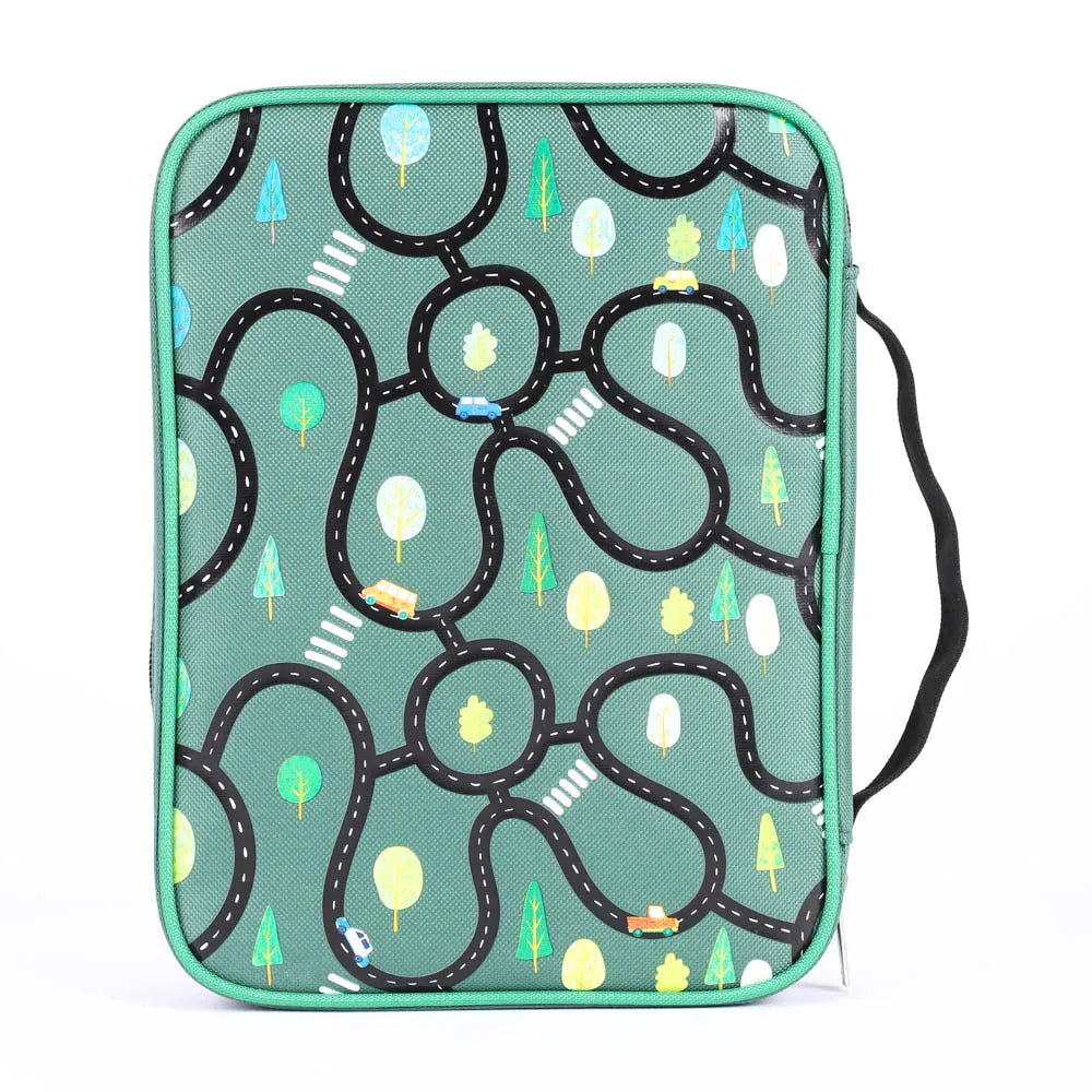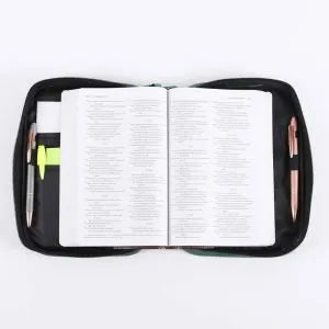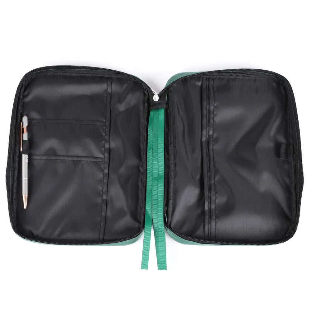 Embodying both style and functionality, the exterior features a bold dark green hue, adorned with roads, cars, and trees like you would see on a map, and you will find this pattern printed on the front and back. It becomes a practical and convenient choice with the addition of a sturdy canvas carry handle and a secure zipper closure, which will guarantee the safety of your Bible and accessories within.