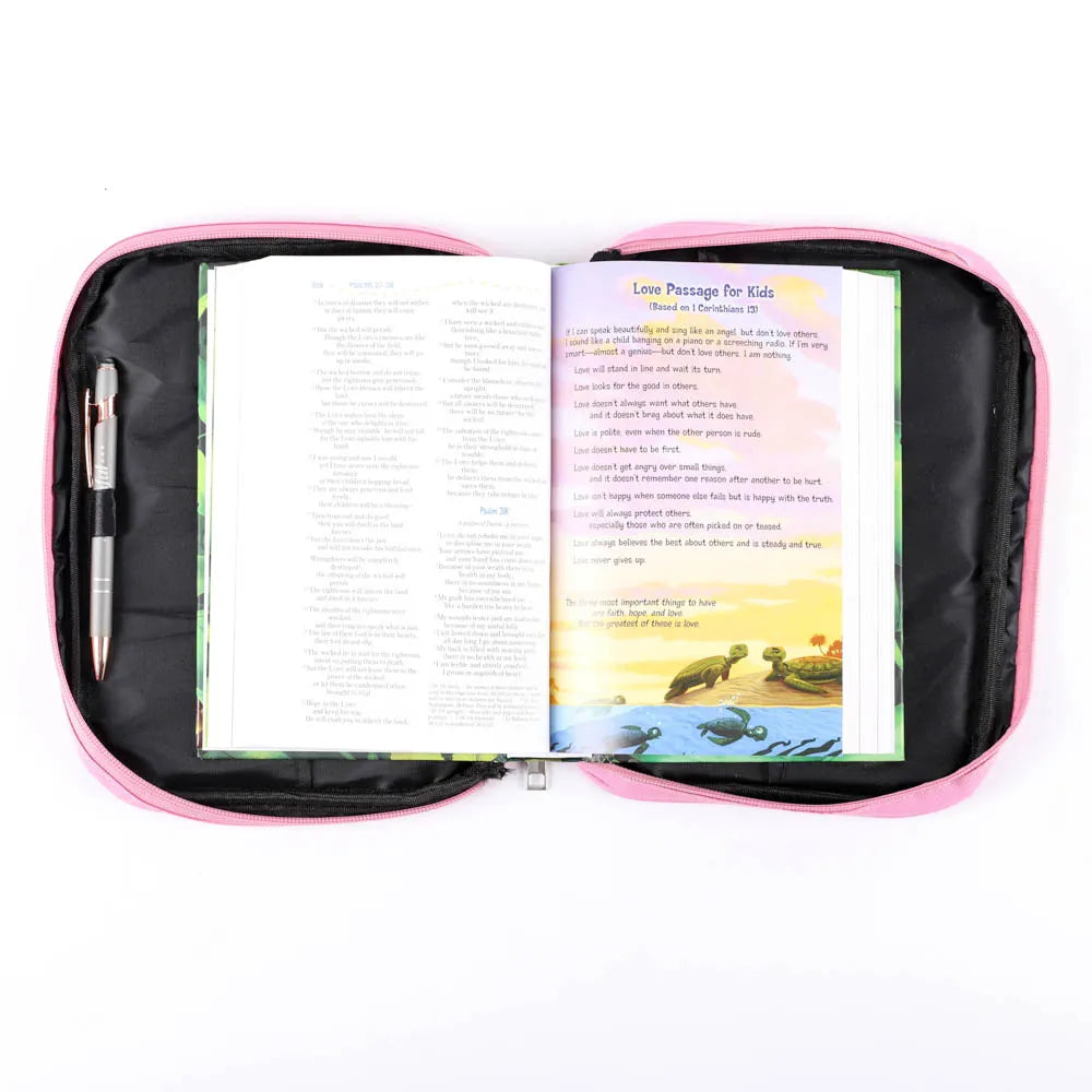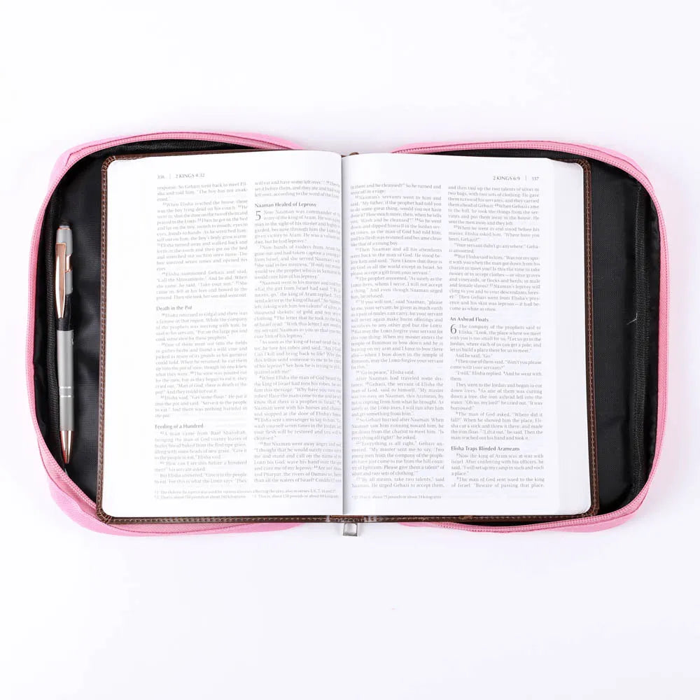 Meet our “Cherished” Bible Cover, a bright Bible accessory just for girls! This large cover, measuring 7.5 x 10 x 2 inches, features a light pink canvas that adds an elegant touch to your Bible.