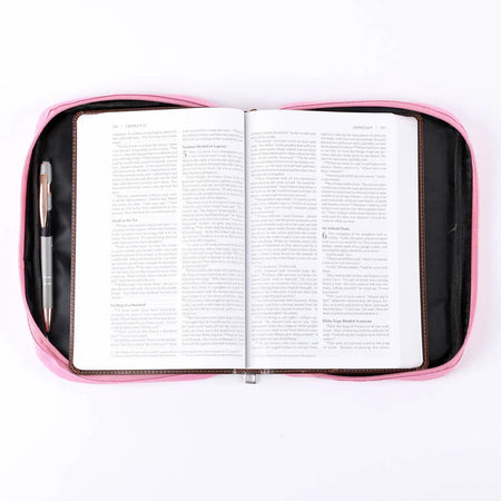 Turn to the back, where a solid light pink canvas maintains the overall charm of the design. Inside, you’ll find a simple yet functional black polyester lining that is both easy to clean and maintain. The interior is thoughtfully designed with book flaps to securely tuck in the cover of your Bible, ensuring it stays protected.