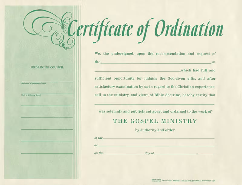 Package of 6 flat certificates (8 1/2" x 11") for minister ordination printed on beige parchment paper with green ink. Space for name, church, location, date and signatures of ordaining council. A free online template for this certificate is available at www.bhpublishinggroup.com.