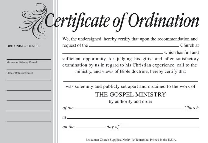 Certificate of Ordination for Minister - Billfold-Size (Package of 1): Measrues 3.625" x 2.5"