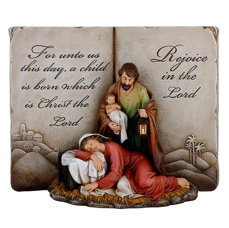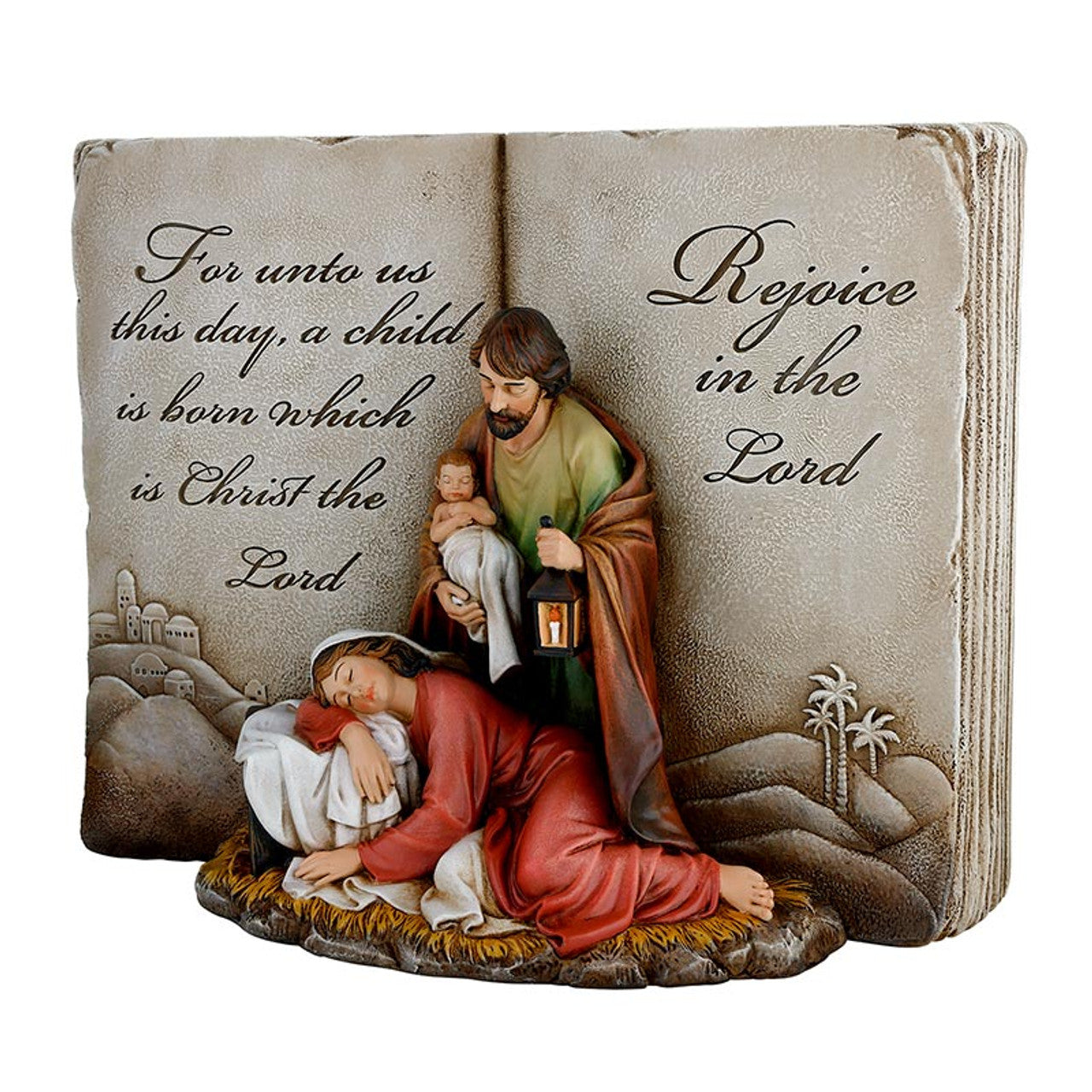 Celebrate the joy of Christ’s birth with the Chapter of Joy Statue. This unique resin sculpture depicts the Holy Family nestled within the open pages of scripture, adorned with the words, “For unto us this day, a child is born…” The detailed craftsmanship and meaningful design make it a standout piece for holiday décor or year-round display, reminding all who see it of the true reason for the season.