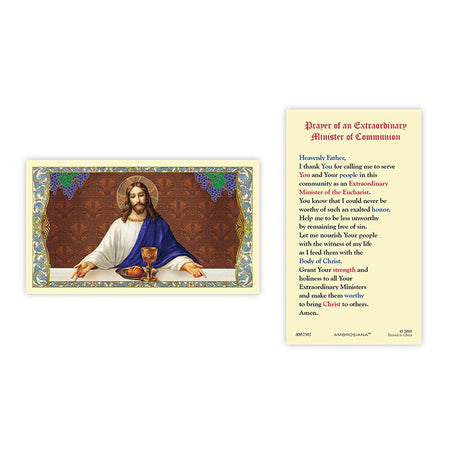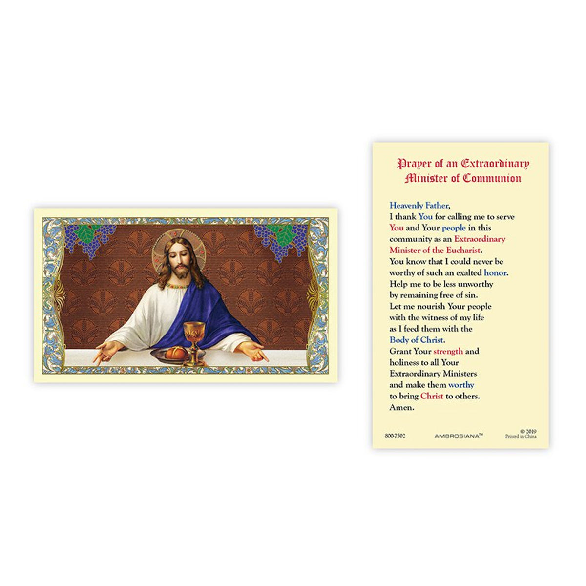 Celebrate the sacred ministry with this beautifully laminated holy card. Each pack of 25 features a reverent image of Christ holding the Eucharist and chalice, artfully framed in gold foil and sealed with crystal-clear lamination. The back carries the heartfelt **Prayer of an Extraordinary Minister of Communion**, offering spiritual affirmation for those honored to assist at the altar.