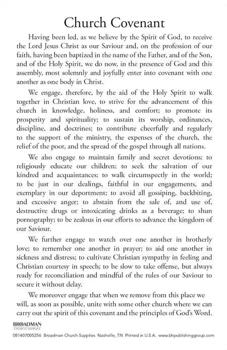 A package of 100, 3 1/2" x 5 1/2" cards printed with model church covenant in black ink with a red design at the top and bottom.