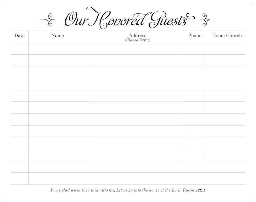 Churches, welcome and receive our honored guests. Broadman offers you a black guest book with a bonded leather padded cover, rounded corners, gilded gold page edges, and ribbon marker. This 58-page book lays flat for the easy signing of over 700 names and addresses. All pages have Psalm 122:1 (I was glad when they said unto me, Let us go into the house of the Lord. KJV) on them and are acid free. This 10 5/8" x 8 1/2" book is black with silver lettering on the cover and comes in a gift box.
