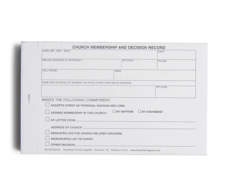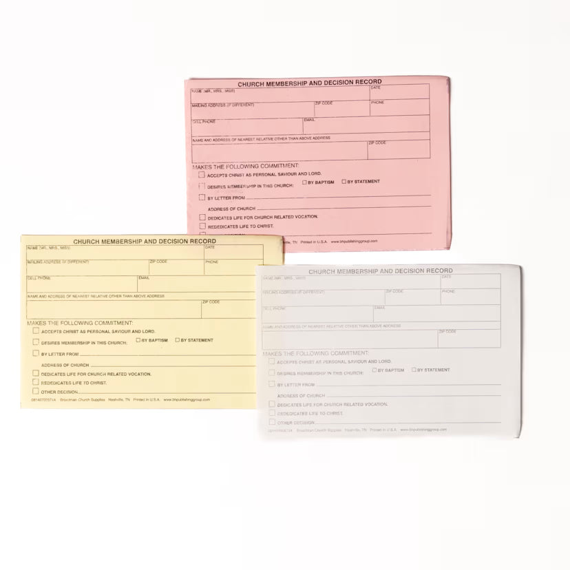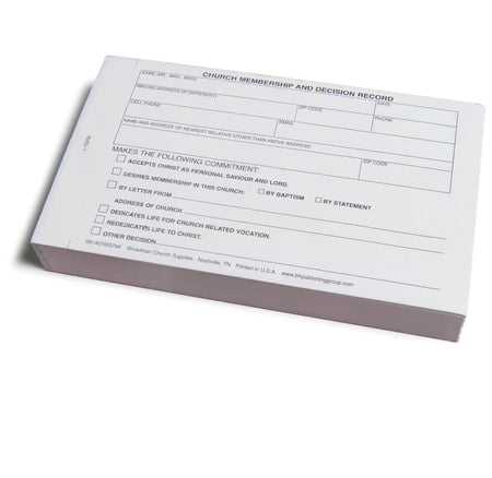 A shrink-wrapped package of 100 Church Membership and Decision Record - Triplicate (no carbon paper required), snap-out forms (6" x 4") to record information about person presenting himself for church membership or other decision. There is one part each for church clerk, pastor, and visitation.