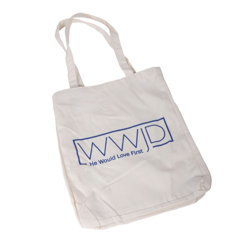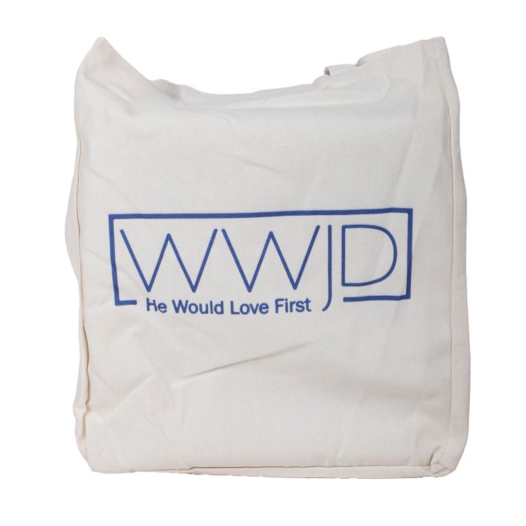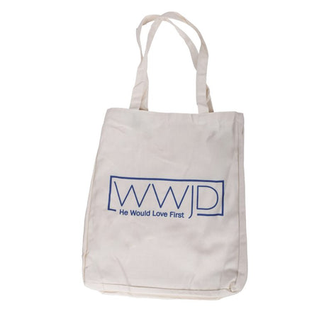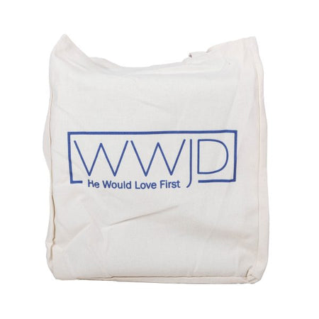 Carry your faith with style and purpose with this Christian tote bag. Made from 100% cotton in a timeless crème color, it features bold cobalt blue lettering that reads “WWJD – He Would Love First.” More than just a practical accessory, it is a daily reminder to live with love, compassion, and devotion. You can use it for church, Bible study, prayer groups, or everyday errands. This tote blends inspiration with function in one classic design.