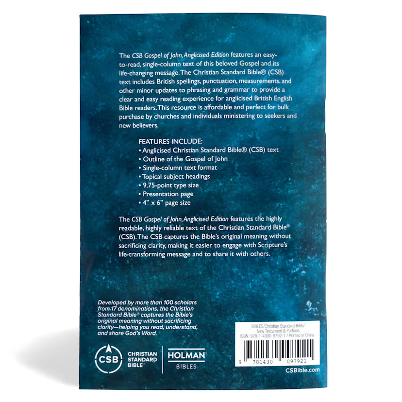 The CSB Gospel of John, Anglicised Edition features the highly readable, highly reliable text of the Christian Standard Bible® (CSB). The CSB captures the Bible’s original meaning without sacrificing clarity, making it easier to engage with Scripture’s life-transforming message and to share it with others