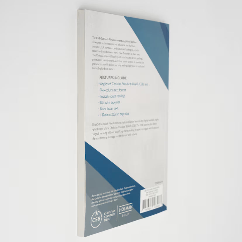 The CSB Outreach New Testament, Anglicised Edition is designed to be accessible and affordable for churches, ministries, bulk purchasers, and individuals looking to provide seekers and new believers with a New Testament of their own. The Christian Standard Bible® (CSB) text includes British spellings, punctuation, measurements, and other minor updates to phrasing and grammar to provide a clear and easy reading experience for anglicised British English Bible readers.