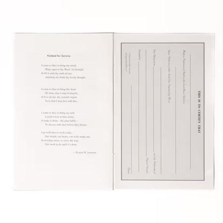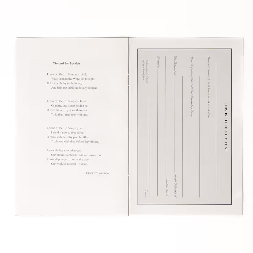 An 8-page booklet (5 1/2" x 8 1/2") from Broadman Press (1936); contains A Church Covenant, Fundamental Facts, Decisions To Do, Yielded for Service poem, and 5" x 7" black and white certificate.