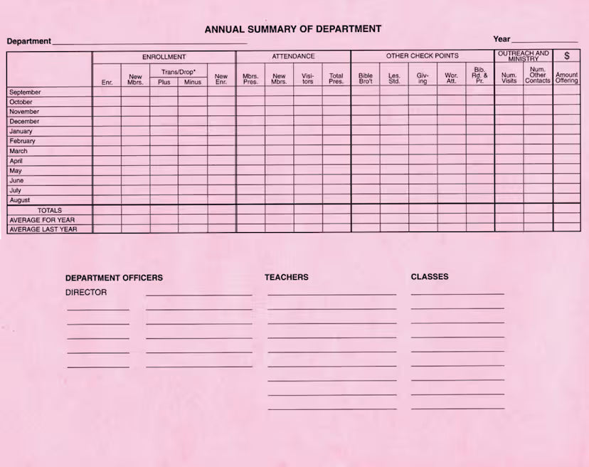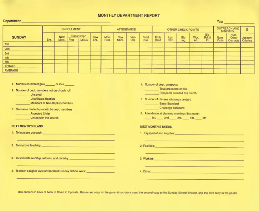A bound book (11" x 8 1/2") for recording weekly, monthly and annual summary of Sunday School report for all departments (20 lines) in triplicate. Carbon paper is included.